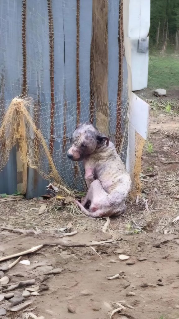 His fur was tangled with dirt, his body thin beneath the grime. He didn’t bark at passersby or pull against the rope. He simply stayed where he had been left, watching the world move on without him. The air was cool, the ground hard, and there was no sign that anyone planned to return.